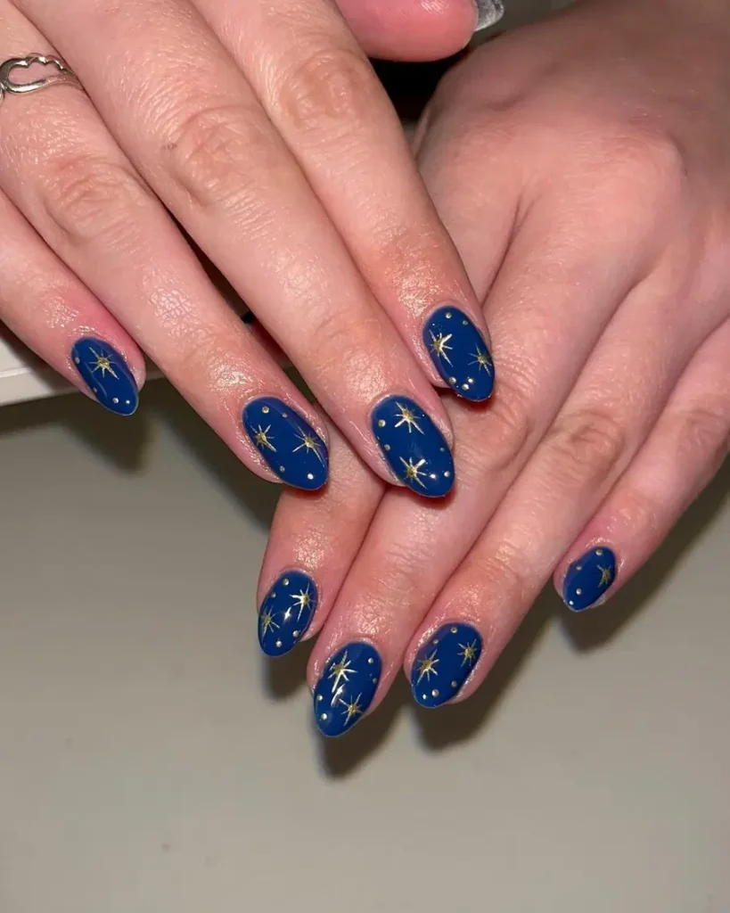 This manicure showcases dark navy blue nails accented with tiny gold star details for a celestial-inspired finish. The clean almond shape and glossy polish keep the look refined, while the star accents add just enough interest to elevate these nails blue into something special.