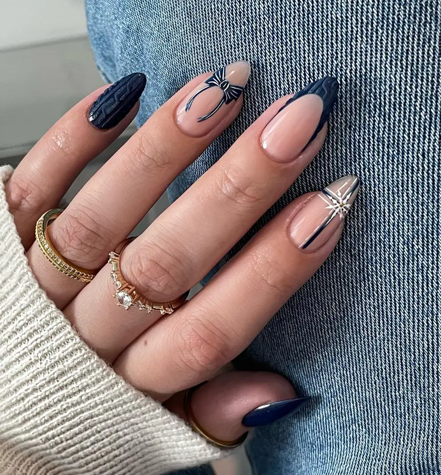 This bold navy blue nails set mixes glossy blue tips, hand-drawn bow art, and textured accent nails for a standout finish. The contrast between smooth nude bases and deep blue details creates visual depth while staying cohesive. A creative take on navy blue nails acrylic that still feels chic and intentional.
