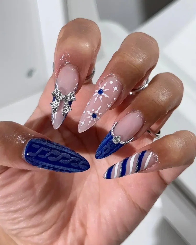 This striking navy blue nail set combines textured cable-knit designs, glossy finishes, crystal embellishments, and soft nude accents. The rich blue tones paired with dimensional details make this manicure bold yet polished a perfect choice for standout navy blue nails with luxury appeal.