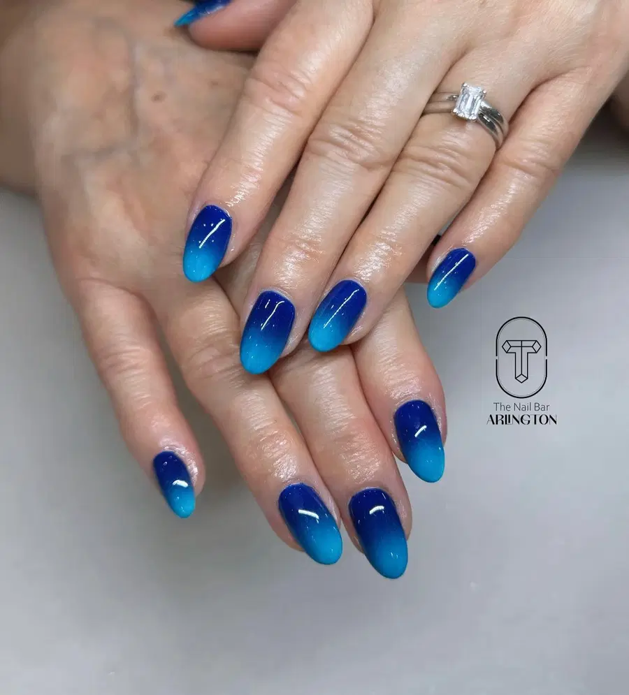 A smooth ombré blend transitions from dark navy blue into softer blue tones, finished with tiny gold stud details. This design feels modern, minimal, and effortlessly chic perfect for polished everyday nails blue looks.