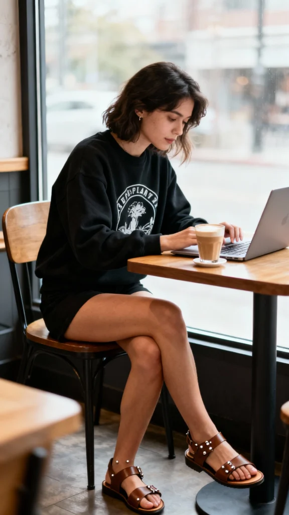 When comfort is the priority but style still matters, this is your go-to. The graphic sweatshirt gives personality; the sandals keep it light. It’s the art of casual done right.