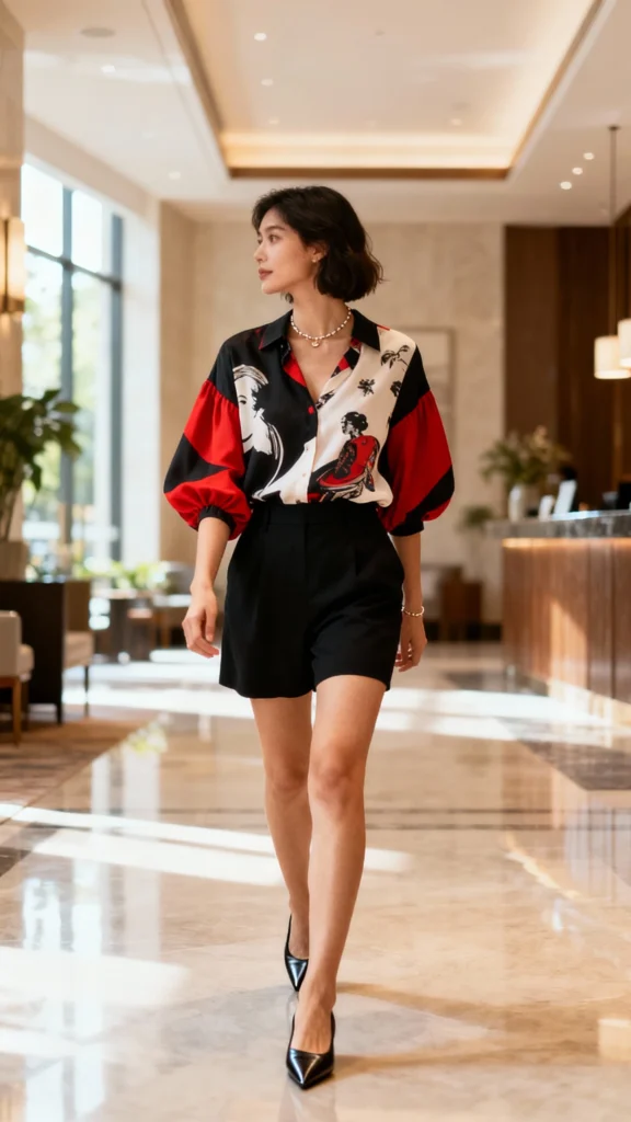 A strong blouse turns black shorts into a full look dramatic sleeves, pleats, or prints are your friend. The pointed flats keep it on the right side of practical while still being chic.