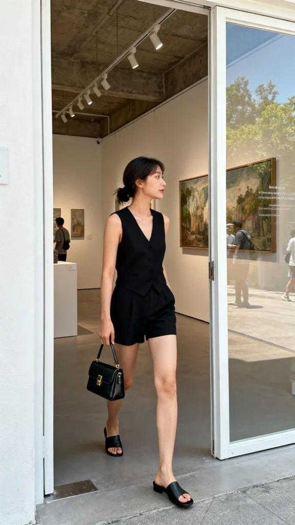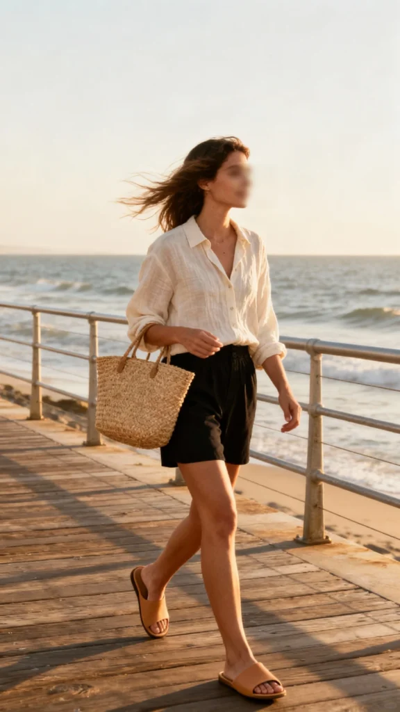 Breezy linen and black shorts are a summer dream. It’s easy, relaxed, and breathable but still polished. Perfect for scorching days when you want airiness with style.
