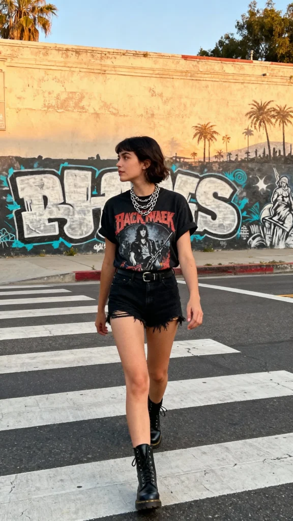 Wear to concerts, dive bars, or casual hangs. Swap boots for high-top sneakers if you’re walking a lot, or add fishnet tights for extra attitude.