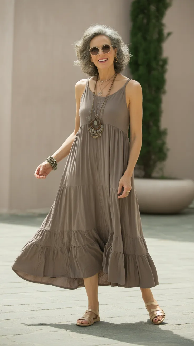 The earth-toned boho maxi dress is a perfect choice for women over 50 who want to embrace a chic and effortless look. This dress features a relaxed fit that flatters a variety of body shapes, making it a staple in any wardrobe. The warm, earthy colors resonate with nature, adding a calming vibe to your outfit.