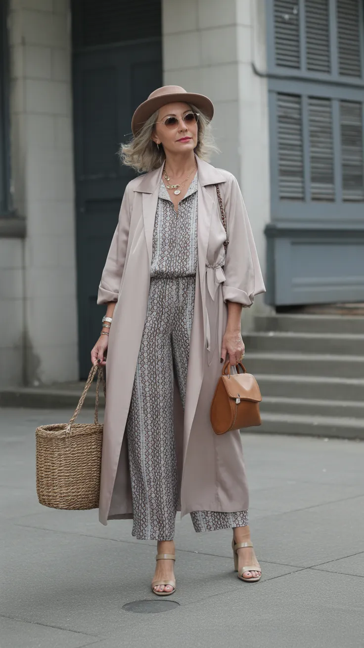 Layering is a fantastic way to add depth to your outfit, especially for over 50 women’s fashion. A neutral duster coat over a printed jumpsuit is a chic choice that balances comfort and style. The duster coat adds a touch of sophistication while keeping the look relaxed.
