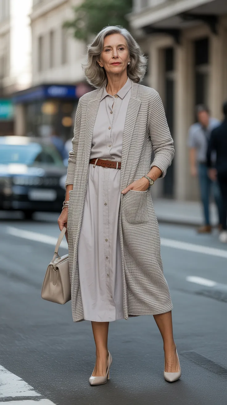 Layering is key for a chic look, especially when it comes to over 50 women’s fashion. A textured cardigan paired with a midi dress creates a stylish yet effortless vibe. The cardigan adds warmth and texture, making it perfect for various occasions.