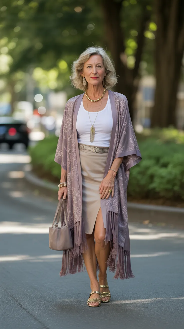 This look is perfect for over 50 women’s fashion, combining comfort and style effortlessly. A fringed kimono adds a playful touch to a simple tank top and skirt combination. The light fabric of the kimono flows beautifully, making it a great choice for warm days or layered looks.