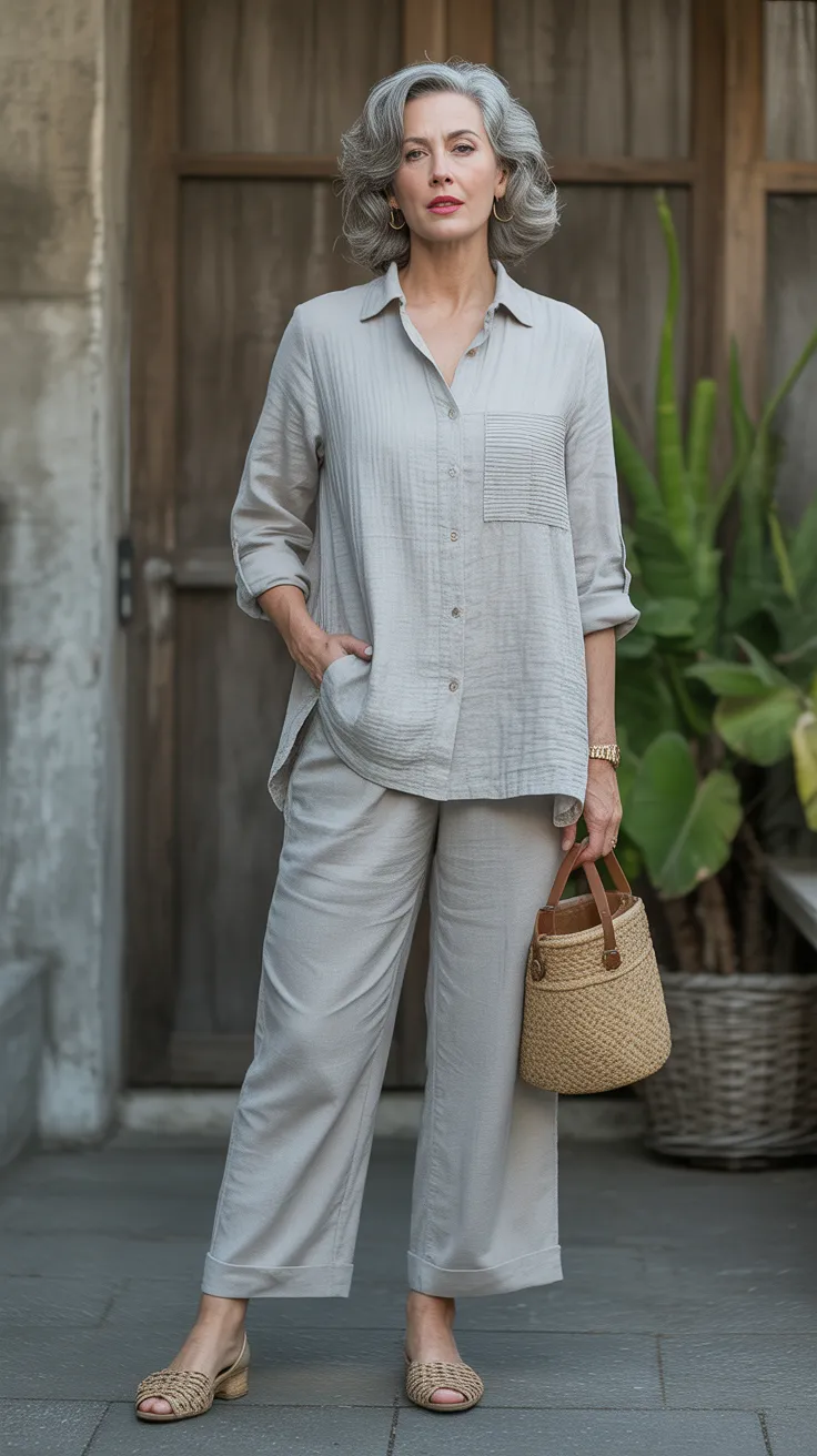 When it comes to effortless style, a textured linen tunic paired with trousers is a winning combination. This look is perfect for over 50 women’s fashion, blending comfort with chic vibes. The soft linen fabric feels great against the skin, making it ideal for warm days.