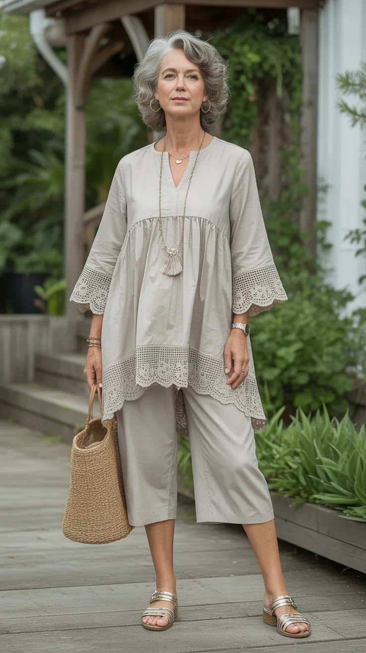 The lace-trimmed tunic paired with capri pants is a fantastic choice for women over 50 who want to embrace a chic and effortless look. This outfit strikes the perfect balance between comfort and style, making it ideal for casual outings or relaxed gatherings.