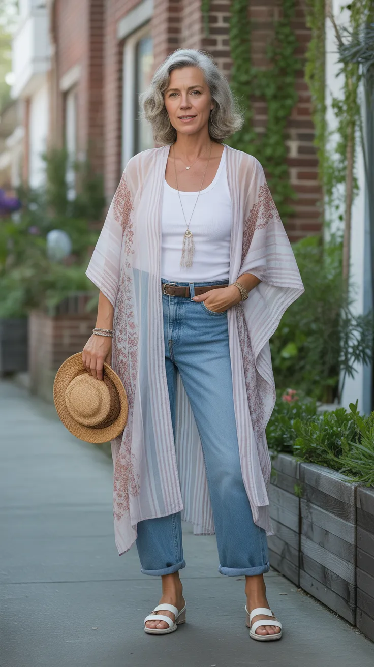 Layering is a fantastic way to add style and comfort to any outfit, especially for over 50 women’s fashion. A light kimono over a simple tank top and jeans creates a chic, effortless look that’s perfect for various occasions. The kimono adds a touch of boho flair, making it a versatile piece in your wardrobe.