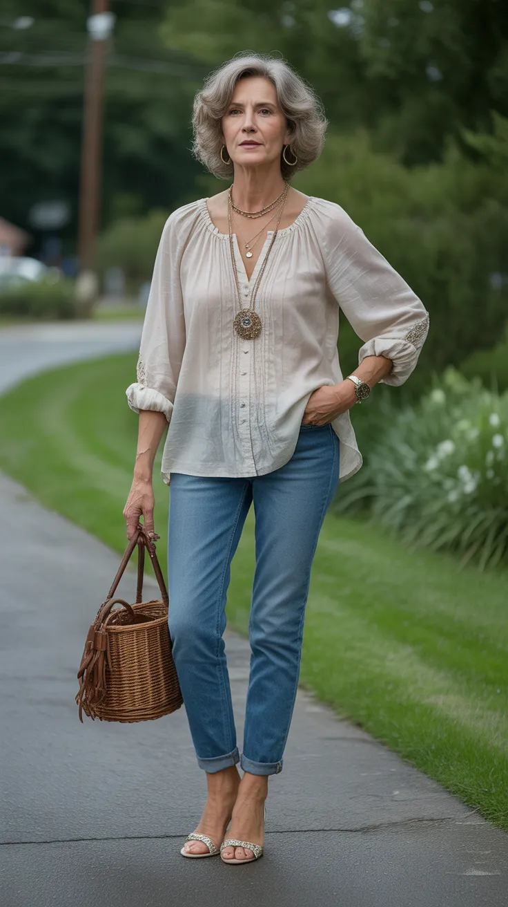 The boho peasant blouse paired with slim-fit jeans is a perfect blend of comfort and style for women over 50. This look is chic and effortlessly modern, making it a go-to choice for casual outings or relaxed gatherings.