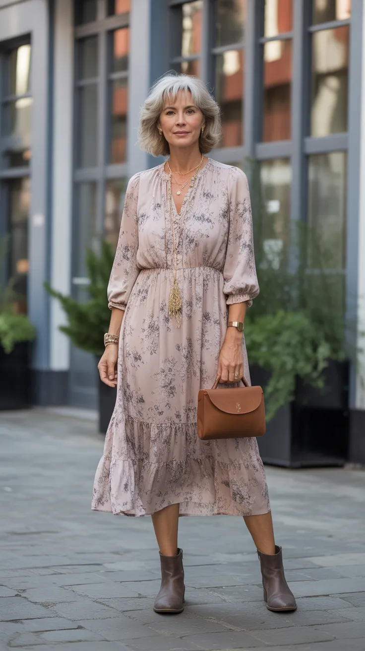 7. Soft Floral Midi Dress With Boots