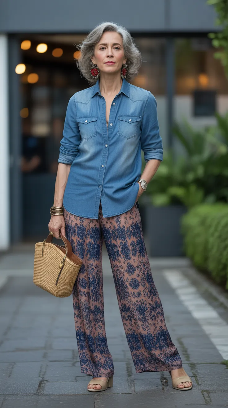 Pairing a denim shirt with patterned palazzo pants creates a stylish and relaxed look that’s perfect for women over 50. The denim shirt adds a classic touch, while the vibrant floral patterns in the palazzo pants bring a fun, boho vibe. This combination is not just chic but also incredibly comfortable, making it ideal for casual outings or brunch with friends.