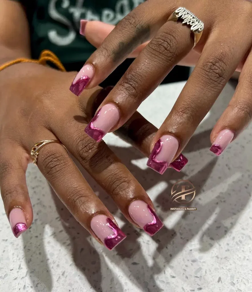 These pink chrome nails feature a soft blush nude base paired with sharp square tips finished in deep pink chrome for a striking contrast. The metallic French tips add a bold, modern edge while keeping the overall look clean and structured. This design is perfect for anyone who loves chrome pink nails that feel confident, trendy, and polished blending classic French styling with a high-shine, fashion-forward twist.