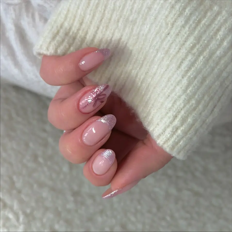 12. Blush Pink Chrome Nails With Soft Pearl Shine and Bow Accents