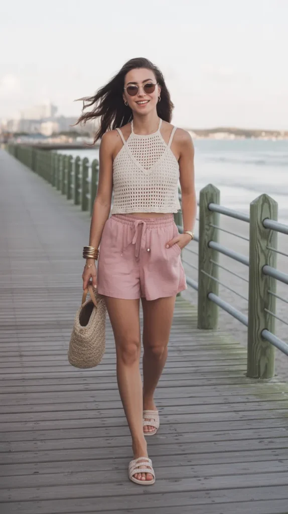 16. Soft Pink High-Waisted Shorts with a Cream Crochet Top, Gold Bangles, Beachy Slides, and a Woven Bag