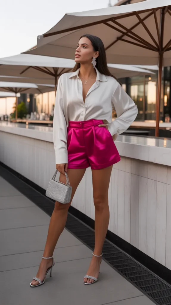 These fuchsia satin shorts turn into a full night-out moment when paired with a crisp deep V blouse. It’s bold, sleek, and just dressy enough for dinner dates or rooftop cocktails. Crystal drop earrings and a sparkly bag add shimmer without overpowering the outfit. Silver heels lengthen the legs and make the pink really pop. It’s a hot pink shorts outfit that brings grown-woman glamour while staying fun and playful.