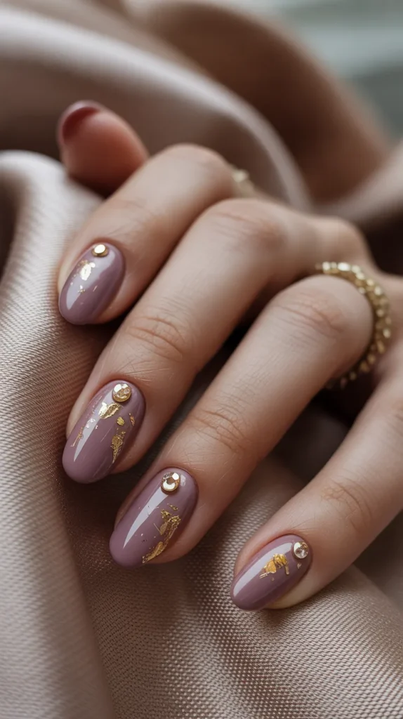 Pink and gold accents add a little sparkle to the everyday manicure. The gold flakes and tiny jewels make the mauve base feel rich and elegant. Perfect for winter weddings or fancy dinners. 💫