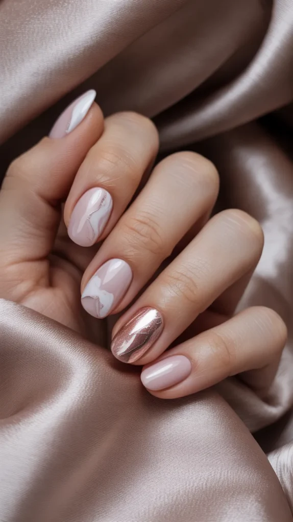 Rose quartz swirl nails bring gemstone beauty to your fingertips. The milky pink base with soft marbling and rose-gold foil catches light beautifully. It’s subtle luxury think spa-day elegance meets winter glam. 💎