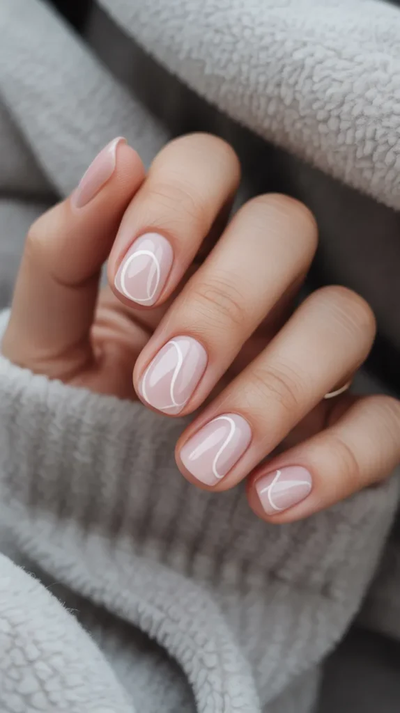 Minimalist pink line art keeps things fresh and modern. The clean white curves over a baby pink base add quiet sophistication. This design works beautifully with short nails and soft winter outfits. 💅