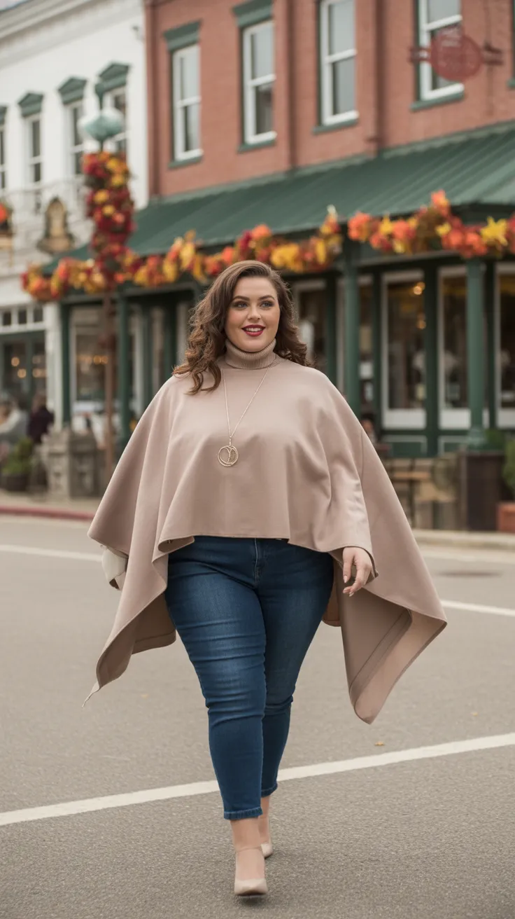 The poncho cape is a fantastic choice for fall style curvy. It adds a layer of warmth while keeping the look stylish and relaxed. The rich colors of the plaid pattern in the poncho create a cozy vibe, perfect for those crisp autumn days.
