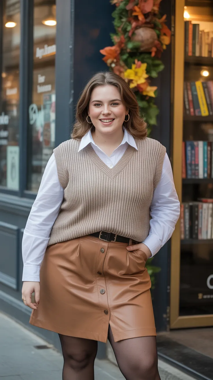 The color palette is warm and inviting, featuring soft tones that blend beautifully for the season. Pairing the sweater vest with a plaid mini skirt creates a chic contrast, showcasing how versatile plus size fall outfits can be.