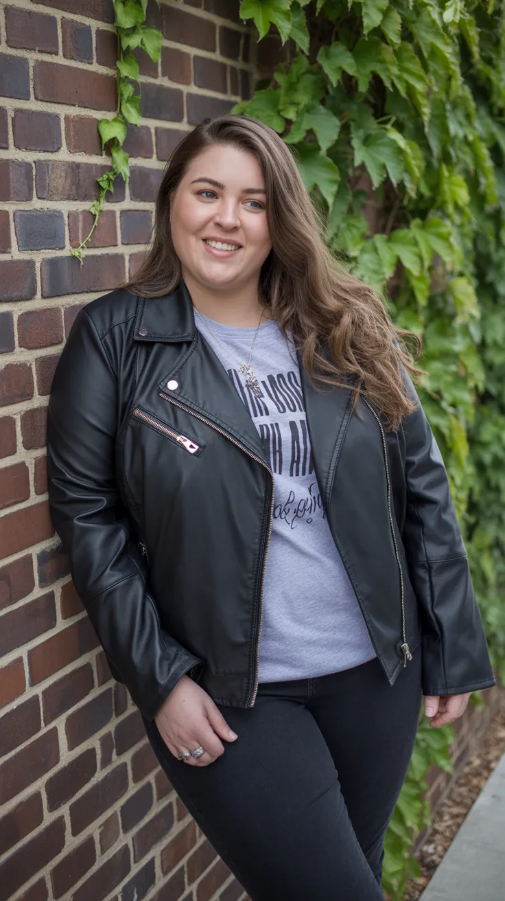 This outfit is a fantastic choice for fall, blending style and comfort effortlessly. The leather moto jacket adds an edgy touch, perfect for those cooler days. It’s a versatile piece that pairs well with many outfits, making it a staple for any wardrobe.