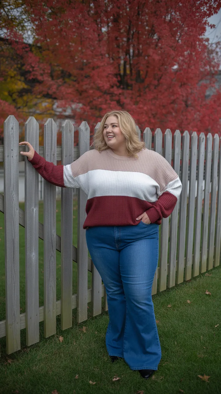 This outfit perfectly captures the cozy vibe of fall while keeping it stylish. The colorblock sweater features warm tones that are ideal for the season, making it a great choice for plus size fall outfit ideas. The soft knit fabric adds comfort, ensuring you feel relaxed while looking chic.