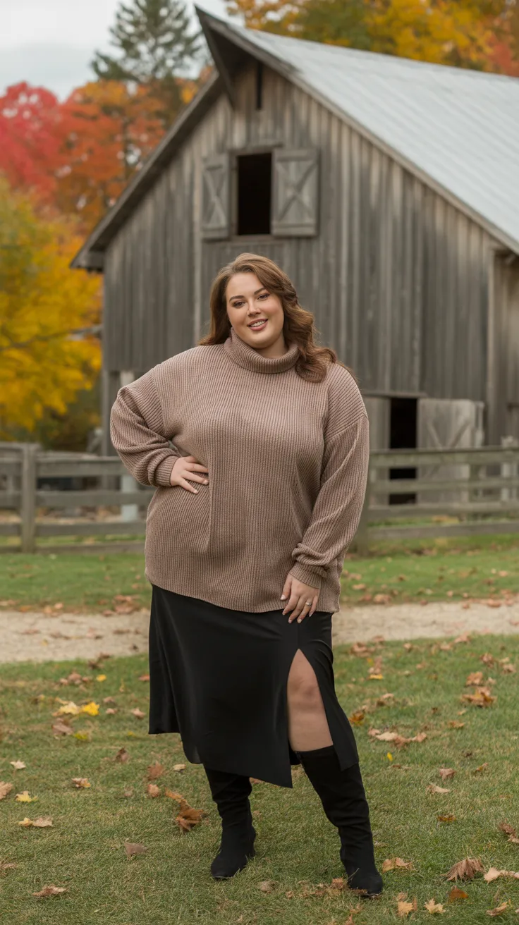 Brown knee-high boots add a touch of elegance and are practical for fall outings. This outfit is a great example of plus size fall outfit ideas that are both chic and functional. It’s perfect for casual outings or even a cozy day at home.