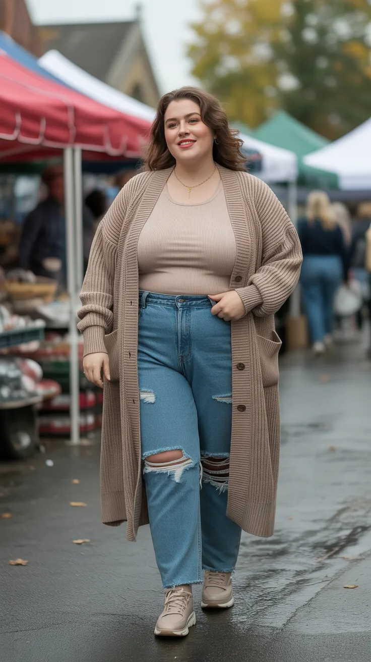 The ribbed tank underneath offers a snug fit that complements the cardigan perfectly. This combination is not only flattering but also practical for layering. Distressed jeans bring a casual vibe to the ensemble, making it suitable for various occasions, from brunch with friends to a casual day out.
