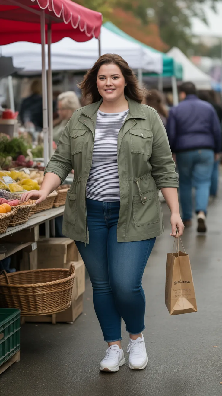 This outfit is a perfect blend of comfort and style for the fall season. The utility jacket adds a touch of rugged charm, making it a staple for any casual outing. Pairing it with a classic striped tee brings a playful vibe, while the skinny jeans create a sleek silhouette that flatters curvy figures.