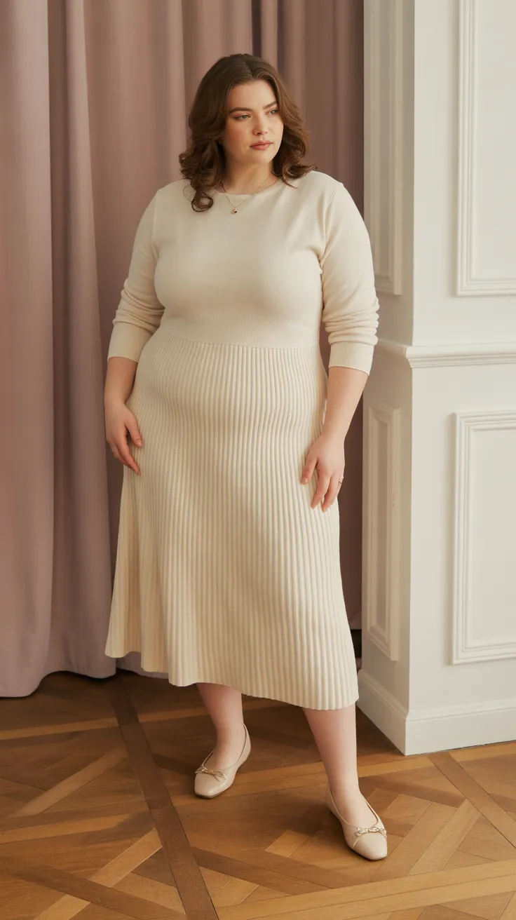 This cream knit midi dress is a perfect pick for a French chic vibe. Pair it with ballet flats for a casual yet polished look that works for any occasion. It’s a stylish option for curvy women looking to embrace effortless elegance in their outfits.