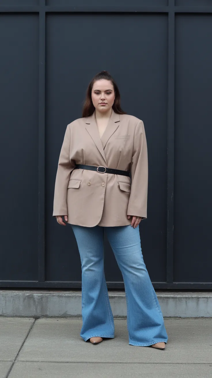 13. Oversized Blazer With Belt And Flared Jeans