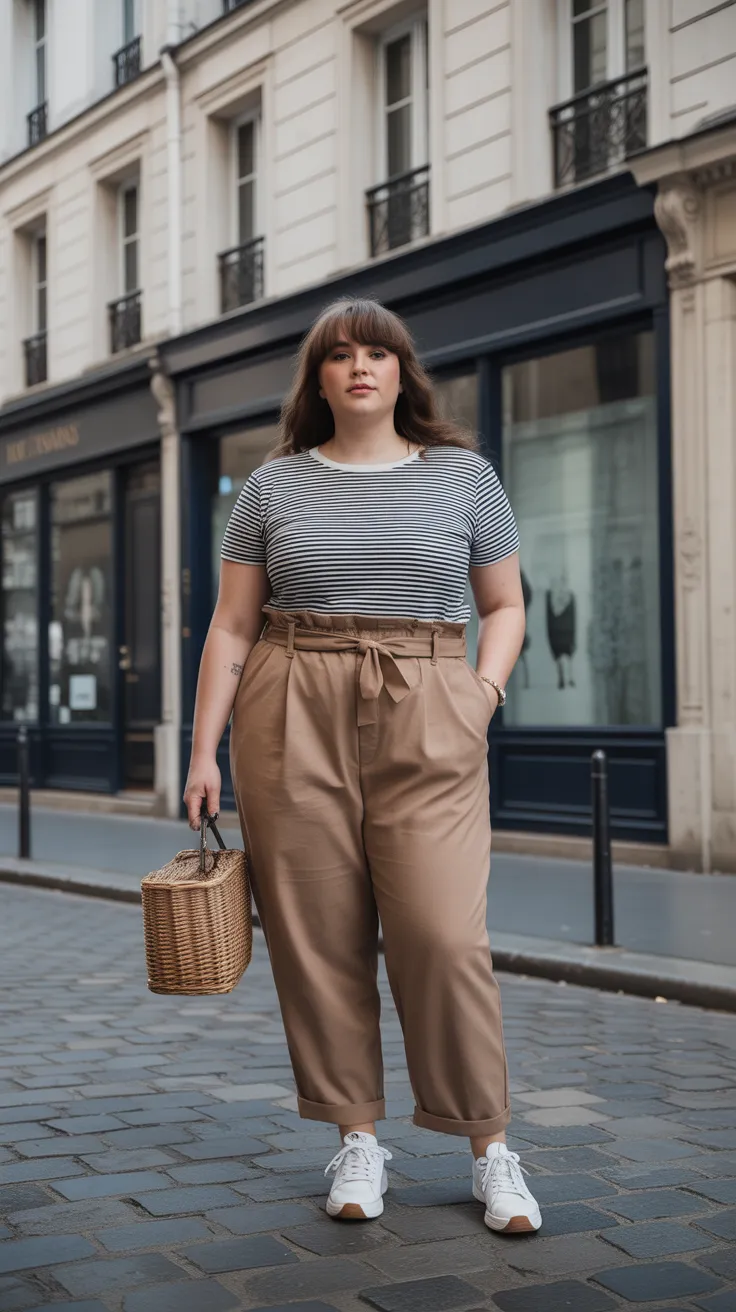Paperbag waist pants are a fun way to add flair to your casual plus size outfits. Pairing them with a classic striped tee gives off that effortless French chic vibe. This look is perfect for everything from brunch with friends to a casual day at the office.