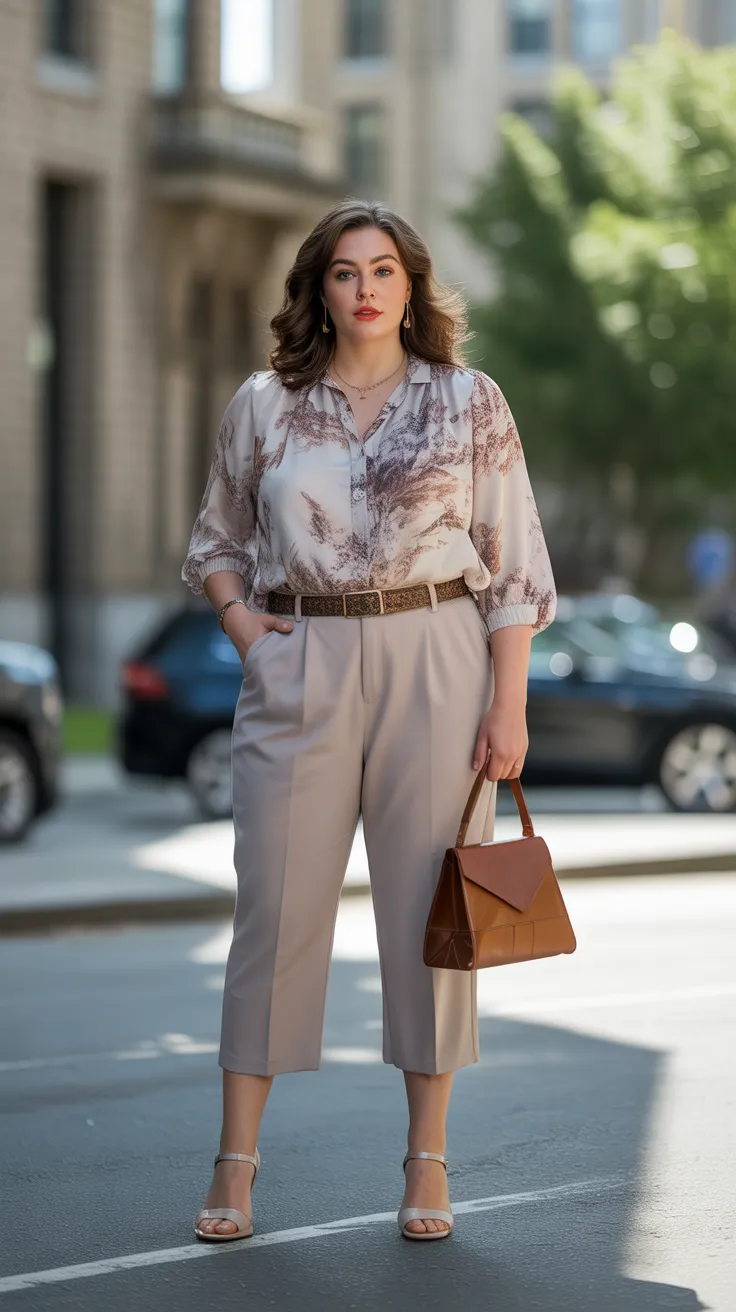 This flowy printed blouse paired with cropped trousers is a perfect example of French chic style. The floral pattern adds a fun touch, making it a great choice for casual plus size outfits or even business formal outfits plus size. It’s all about feeling confident and stylish in outfits for curvy women, and this look nails it!