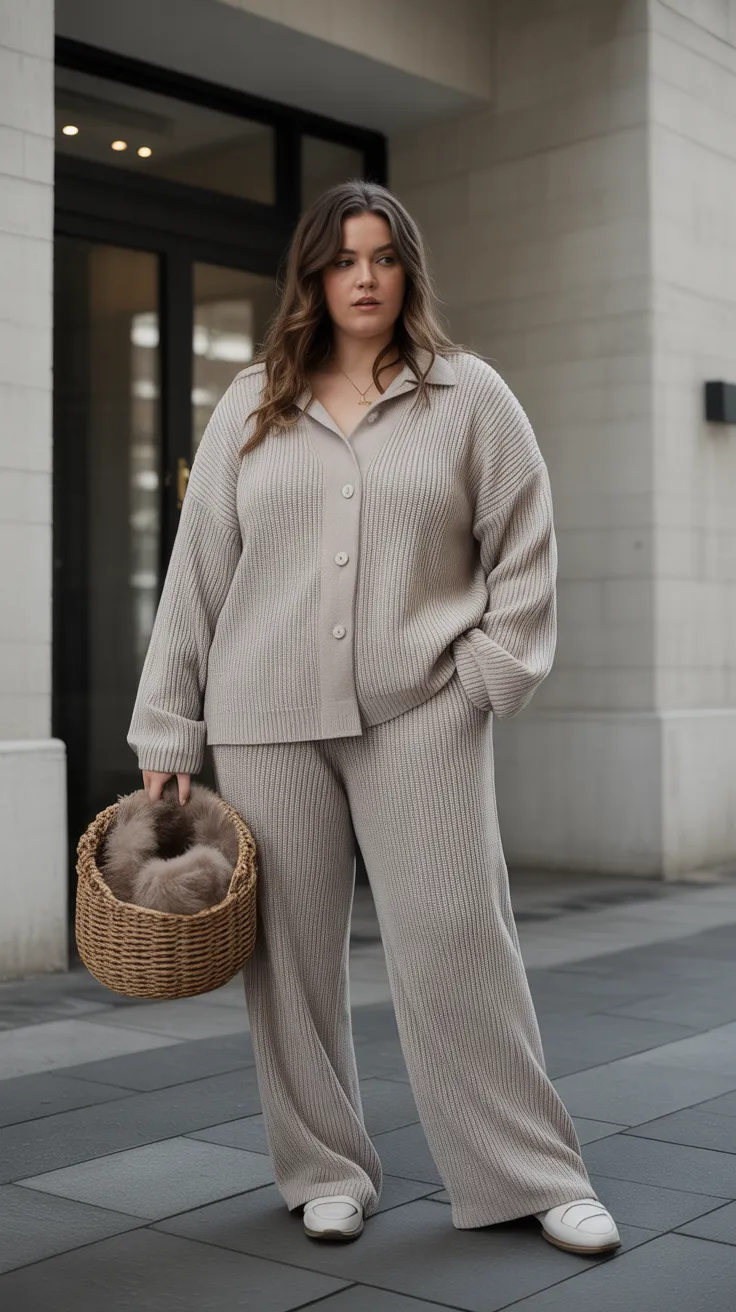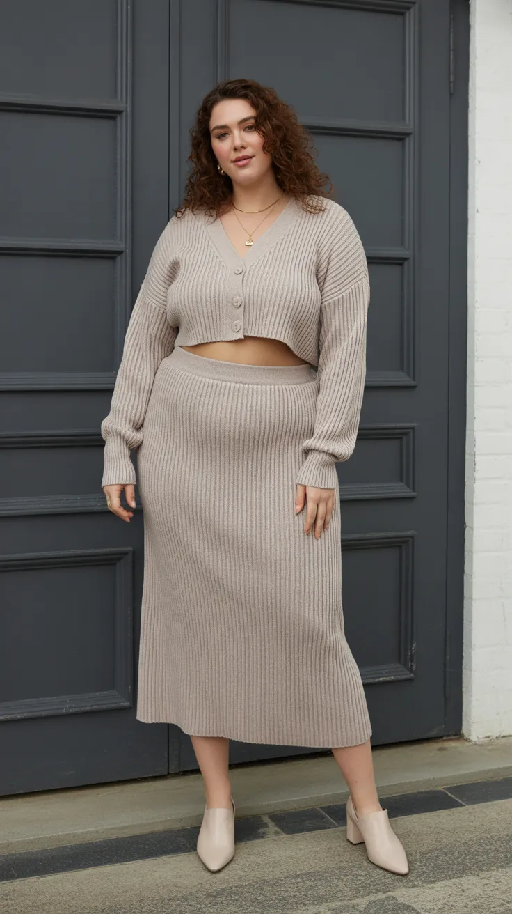 This knit set is a perfect blend of comfort and style. The cropped cardigan paired with a midi skirt creates a chic silhouette that flatters curvy figures. It’s a go-to option for casual plus size outfits that still feel polished and put together.