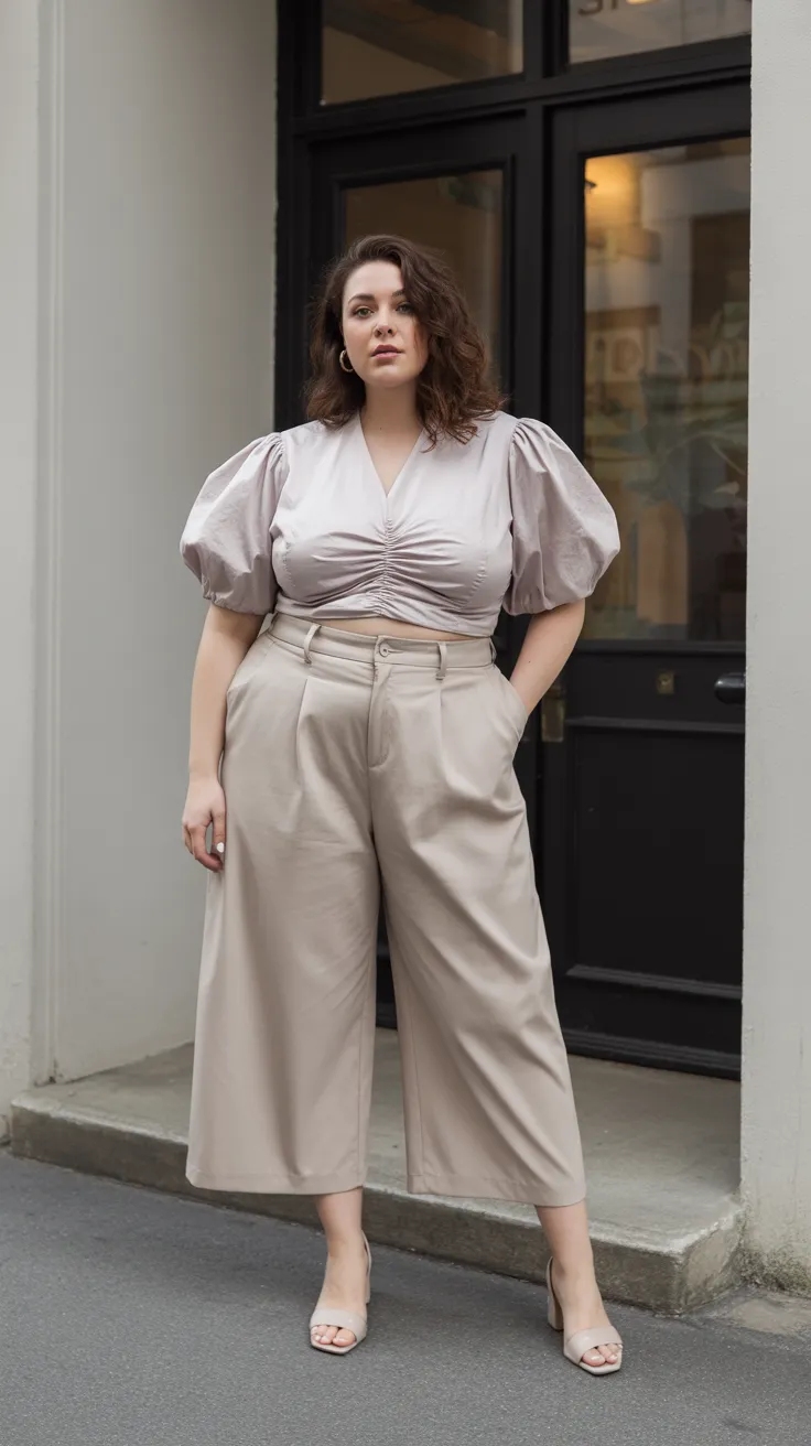 Wide-leg cropped pants paired with a tucked puff sleeve top create a chic and flattering look for curvy women. This outfit strikes the perfect balance between business formal outfits plus size and casual plus size outfits, making it versatile for various occasions. Embrace French chic style with this effortlessly stylish combination that highlights your curves beautifully.