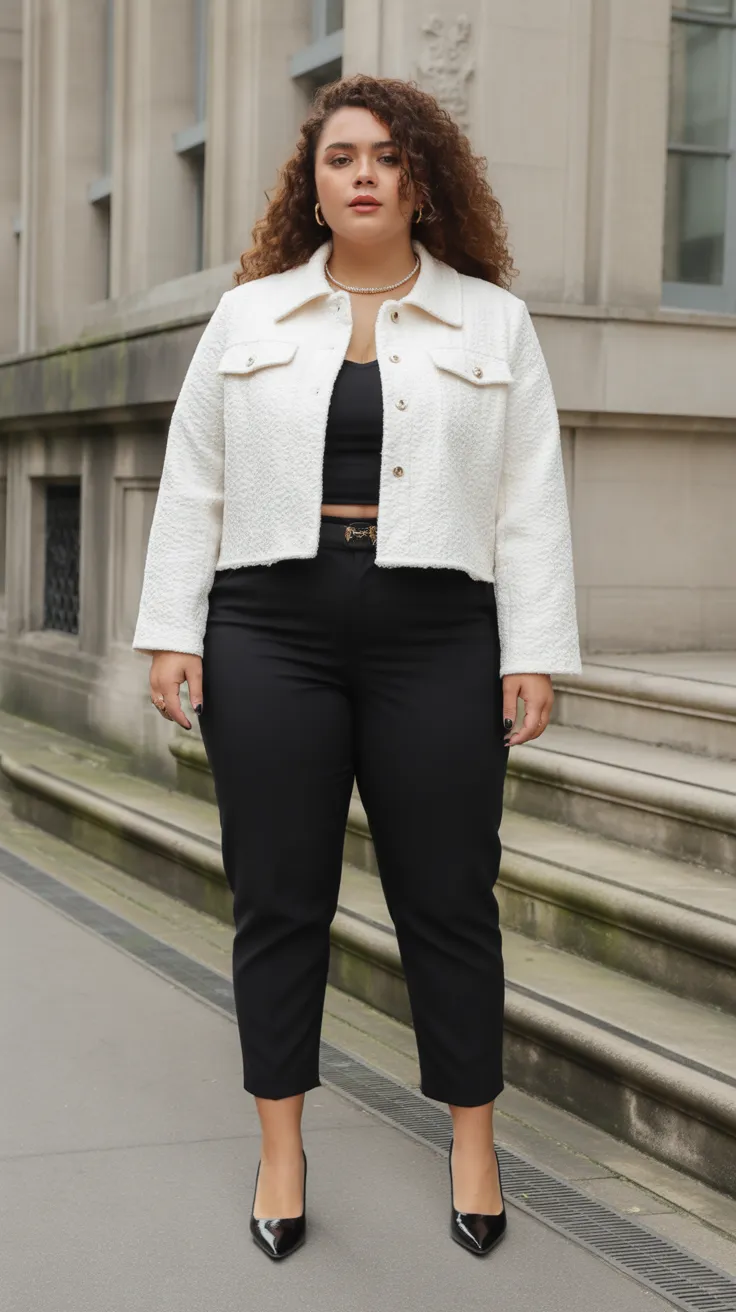 A cropped bouclé jacket paired with black cigarette pants is a classic choice for those seeking French chic vibes. This look is perfect for curvy women wanting to blend style with comfort, making it ideal for both casual outings and business formal outfits. With its tailored fit and elegant silhouette, it’s a go-to for effortless plus size looks that make a statement.