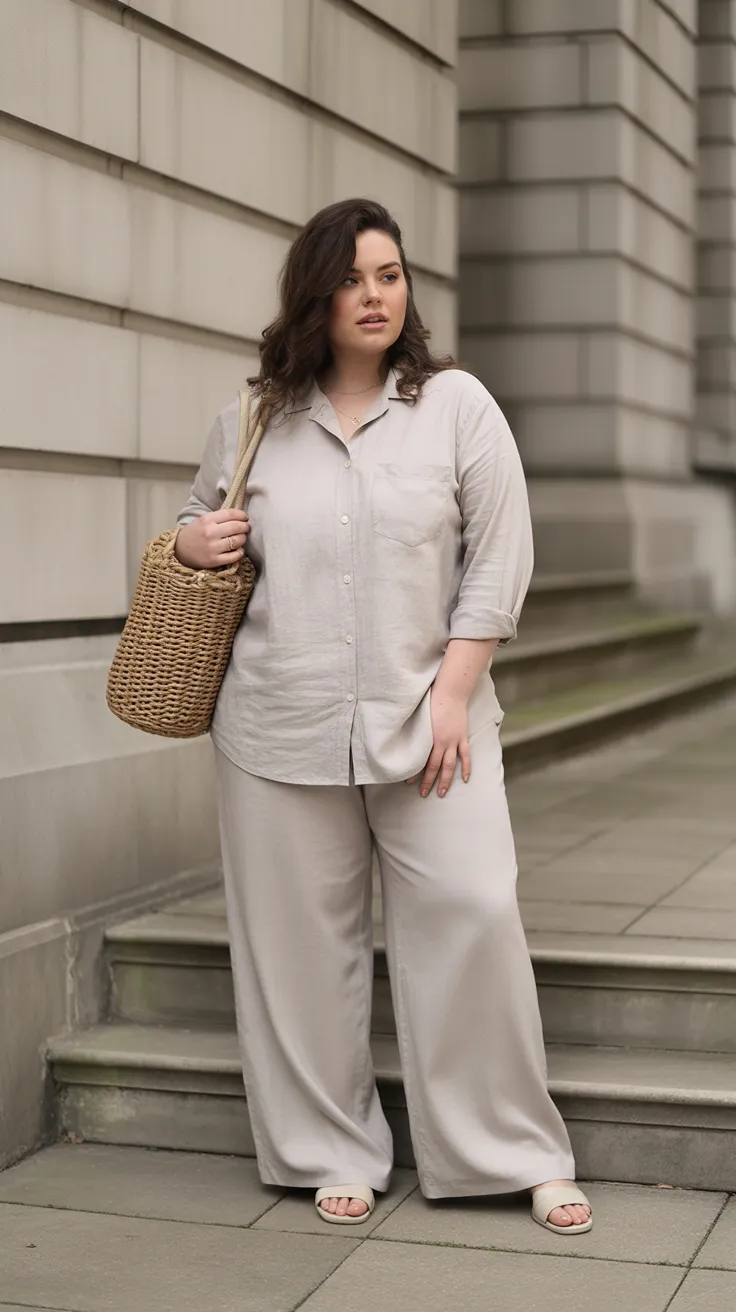 This relaxed linen set is perfect for those sunny days when you want to feel stylish yet comfortable. The button-down shirt adds a touch of French chic, making it a great choice for casual plus size outfits. Pair it with some cute sandals, and you’re ready to take on the day with confidence!