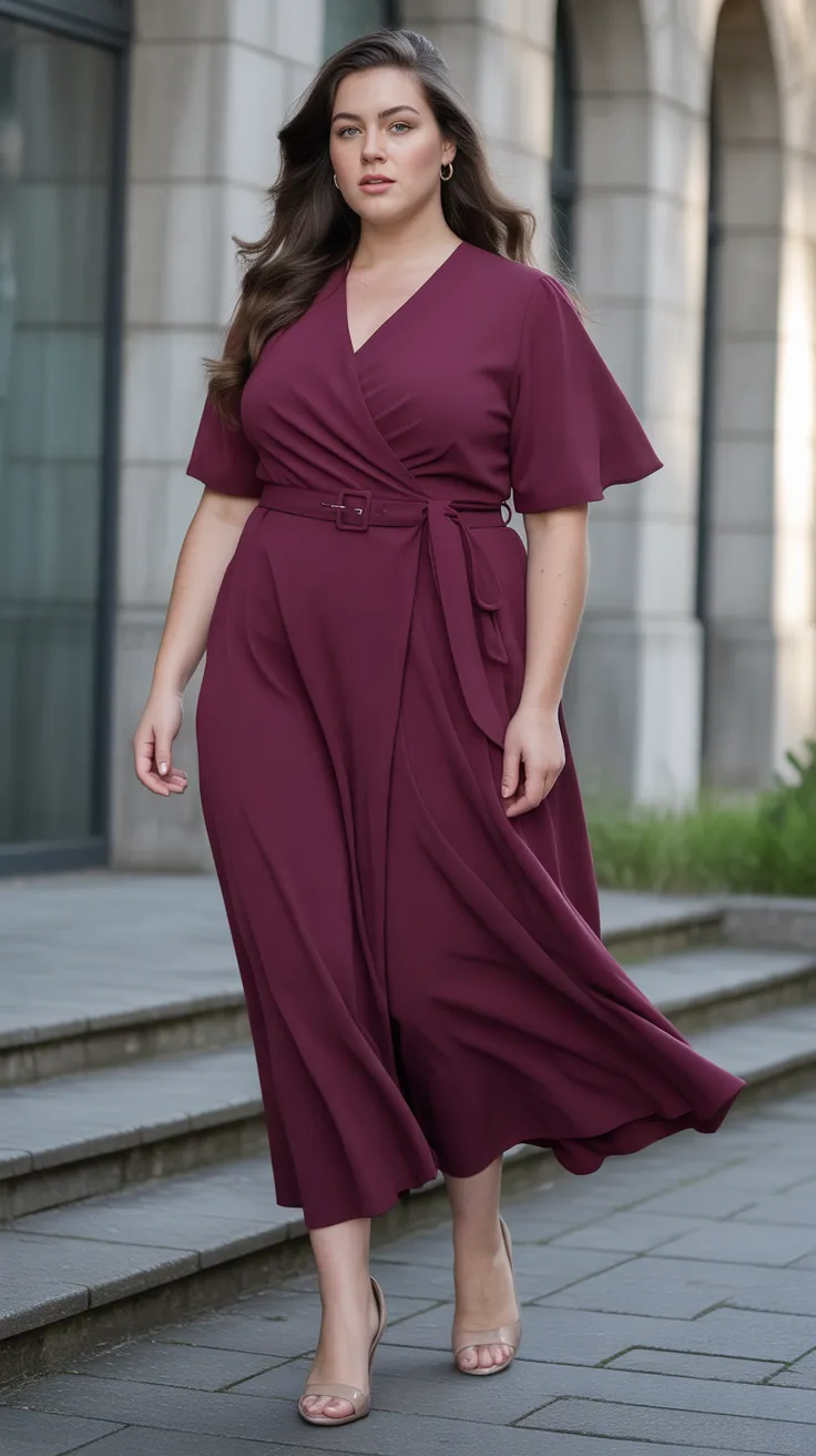 This belted wrap dress in burgundy crepe is a stunning choice for any occasion. Its flattering silhouette makes it perfect for business chic plus size outfits or a casual outing. Pair it with your favorite accessories for a chic, effortless look that celebrates your curves!