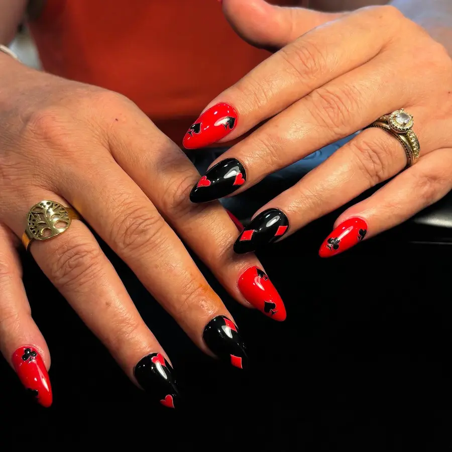 High-shine red and black polish creates a bold, dramatic contrast across each nail. Small card-inspired symbols add a playful touch while keeping the look sleek and refined. The almond shape enhances the elegance, giving these red and black nails a confident, dark femme feel that looks powerful and polished.