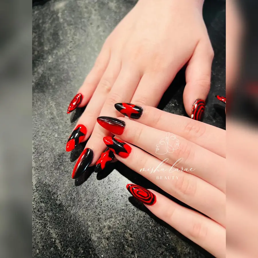 16. High-Contrast Red and Black Swirl Stiletto Nails
