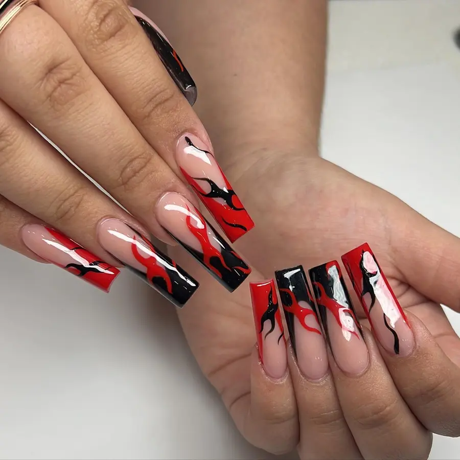 A sheer nude base lets the flowing red and black flame swirls stand out beautifully. The design moves across each nail with a bold, edgy feel while still looking clean and glossy. With long square tips and sharp contrast, these red and black nails give off serious dark femme energy without feeling too heavy.