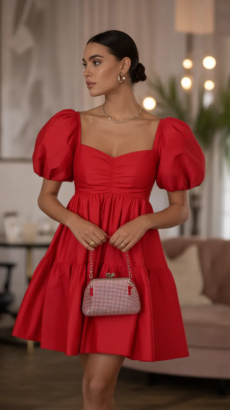 16. Red Puff-Sleeve Babydoll Dress With Rhinestone Bag