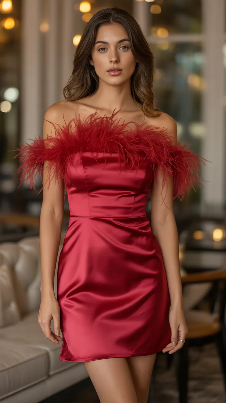 The off-shoulder satin red dress with feather trim is a stunning choice for any birthday celebration. This dress combines elegance with a touch of fun, making it perfect for a party night dress. The satin fabric gives it a luxurious feel, while the feather trim adds a playful twist.