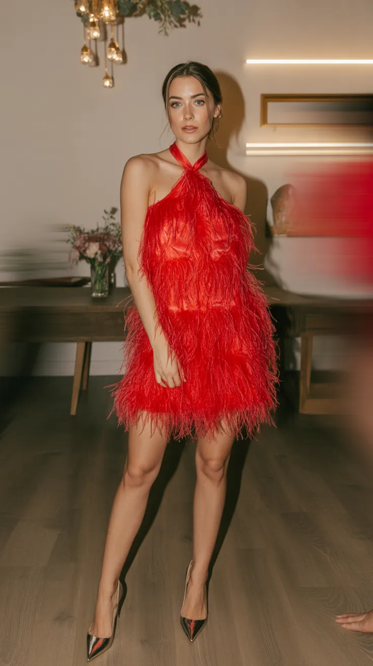 This stunning feathered red halter dress is the perfect choice for your next birthday celebration. The vibrant red color instantly grabs attention, making it a standout piece for any party night dress collection.