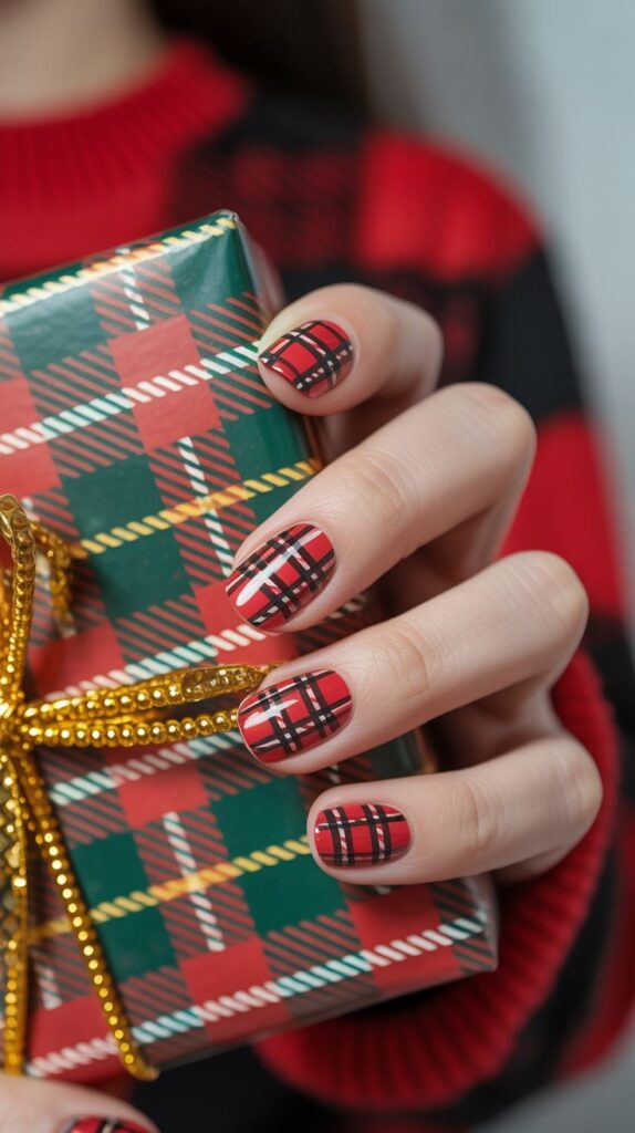 Cozy up with sweater-inspired christmas gel nails featuring red, black, and gold plaid lines. This look brings warmth and nostalgia to your holiday outfits perfect with knitwear and cocoa in hand.