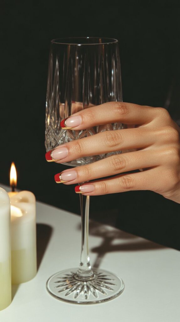 A festive spin on a timeless favorite. Keep your base neutral and line your red tips with fine gold edges for refined elegance. This design feels sophisticated yet joyful great for Christmas dinners or New Year’s Eve.