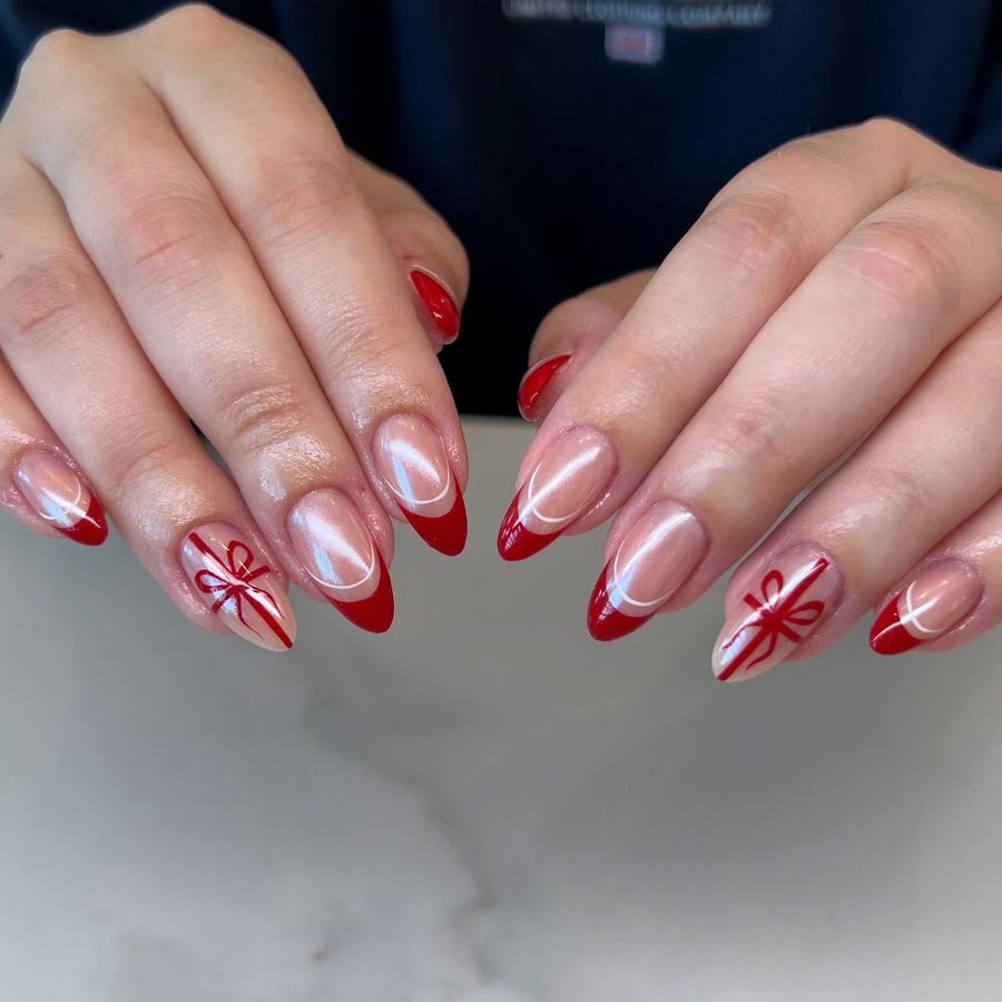 Striking red French tips are paired with elegant ribbon-style designs on accent nails, creating a polished and festive look. Glossy, sharp, and eye-catching perfect for adding personality to simple red tips.